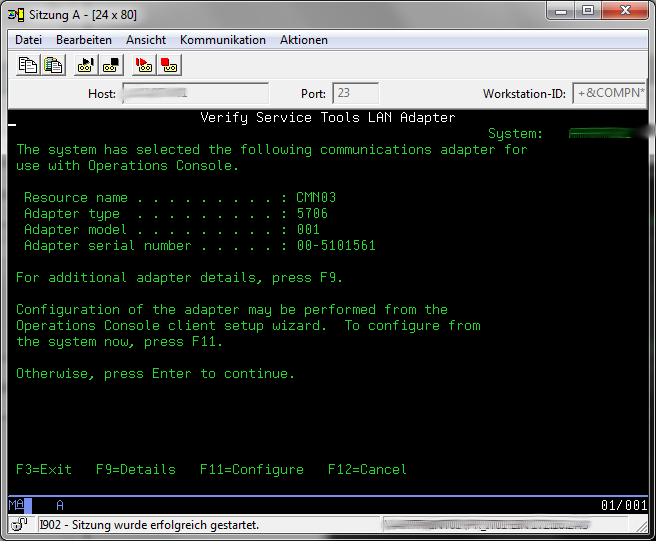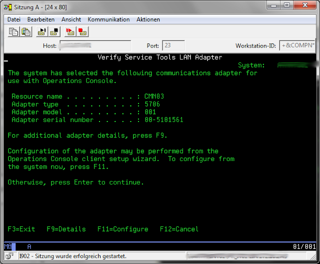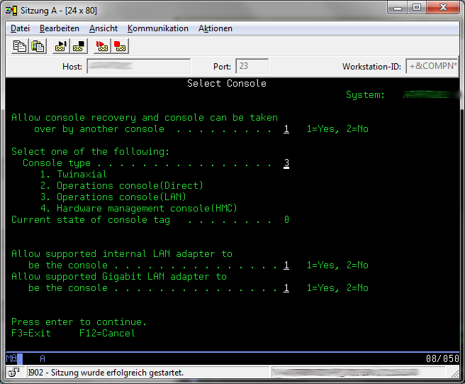 Locate the LAN Console Port on your system. For our Modell 520 it is the T5 port. If you are unsure check the Power Systems info center for informations how to locate the Lan Console port. Check with wrkhdwrsc *cmn and wrkcfgsts *lin that there is no active line description configured for this ethernet port. The Lan Console port cannot be shared with other Ethernet lines on your system.