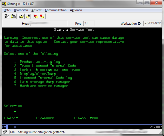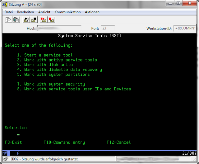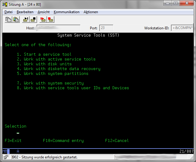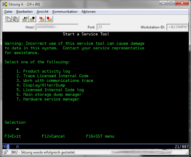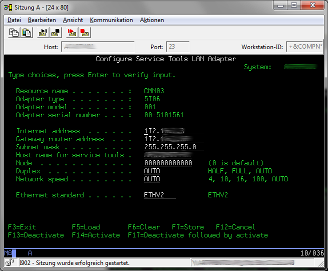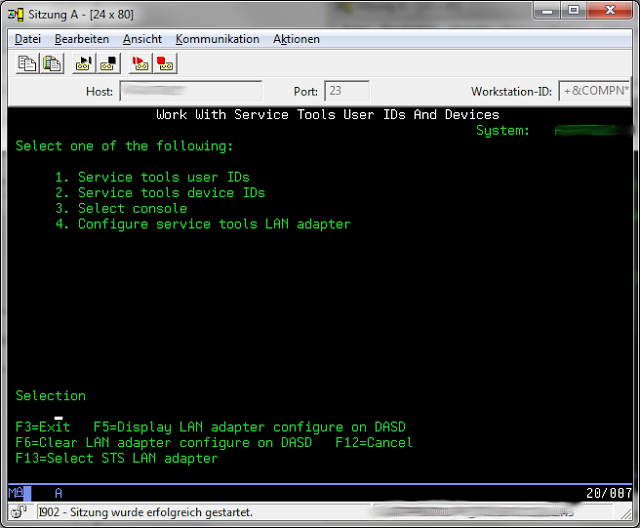 Fill in a static IP Address for the LAN Adapter and the default gateway and subnet mask matching your LAN configuration. As an Hostname for service tools you can use every symbolic name you want for example "SYSCONSOLE1". This IP address habe to be unused and must not match any IP Address of other servers in your network. Then press "F7" to store your configuration and go back with multiple "F3 presses to the start screen of the SST.