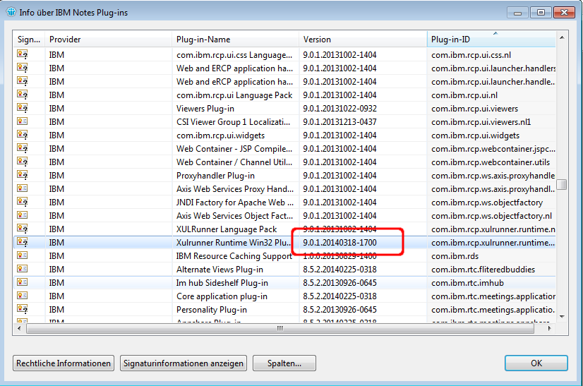 Maybe IBM will provide Fix Packs with newer versions of XULRunner in the Future. So maybe it is worth to double check if the above path is still correct. The easiest way to find the version number is to Open the "Info" Dialog of Notes and choose "Plugin Details" and search for the XULRunner plugin. Then use the version number shown for the change in the rcpinstall.properties.