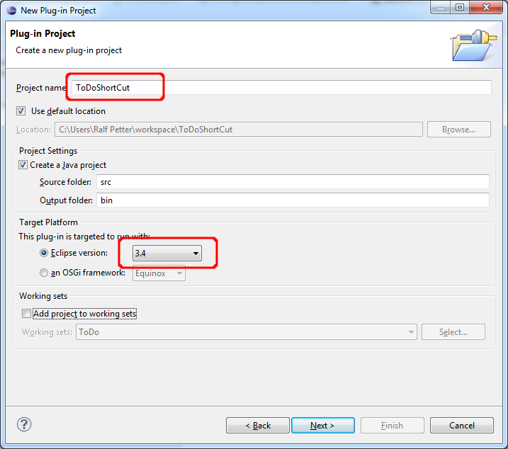 Choose a name for your project and select Eclipse version 3.4 as the target to run.