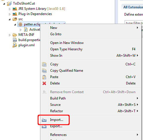 Version: It is very important that the version number is different every time you rebuild your plugin. If you change something in your plugin and deploy it to a client which already have a plugin with the same version number, that plugin will not be updated to the new version. This are very difficult to find problem. So my recommendation add ".qualifier" to the version number. Eclipse will add the date and time to the version number so that you have a new version number when you rebuild your plugin.