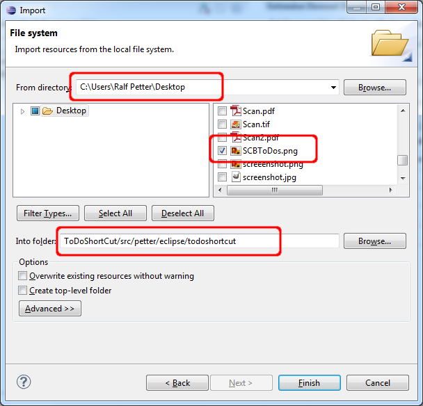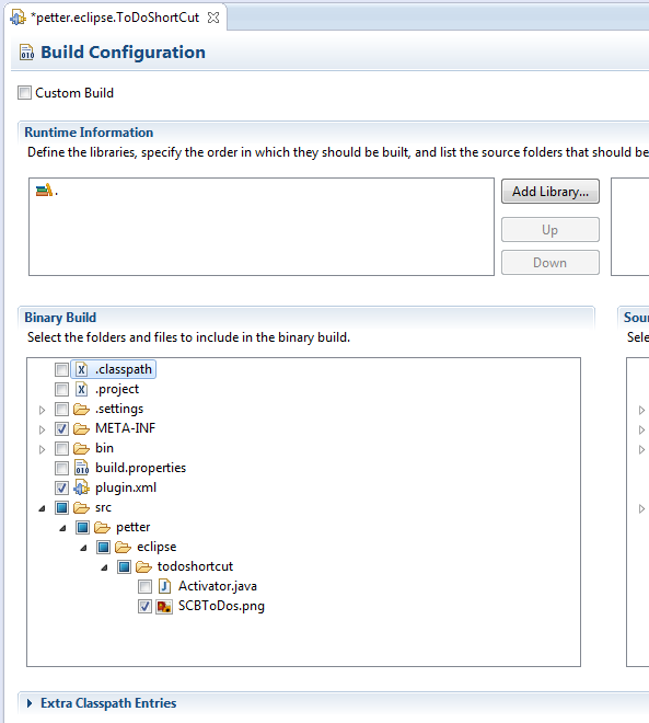 Double click the build.properties in your plugin and select your icon in the binary build path. This is a very important step, because normally the content of the src folder will not be exported when you build your plugin. So if you do not tell eclipse about your images in the build configuration you will have only a red dot instead of your beautiful icon. Save and close the build configuration.