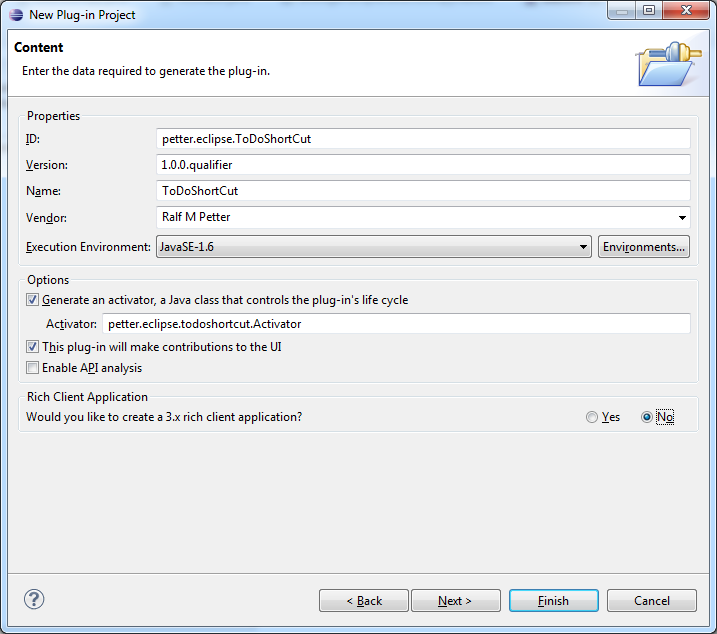 Activator: Tell Eclipse in which java package the Activator (controls the plugin's life cycle) should be created. It is good practice to create alle classes of a plugin in a package named similar to the id of the plugin.