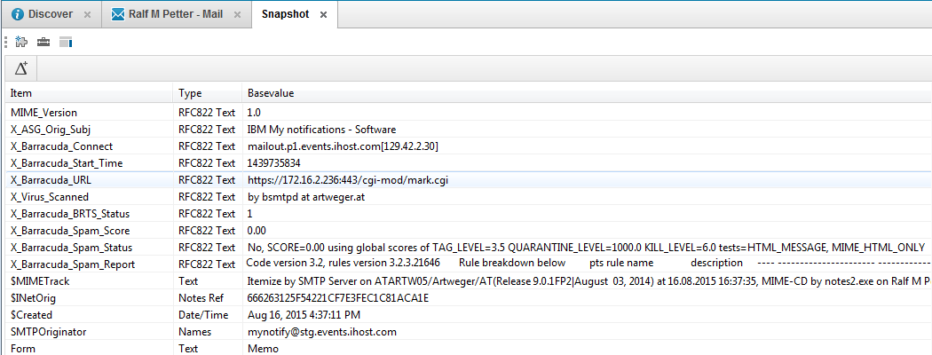 The snapshot of the current state of the mail document will be opened in a new window and is the baseline for our analysis.
