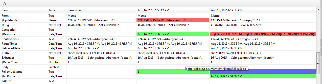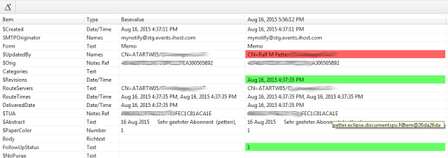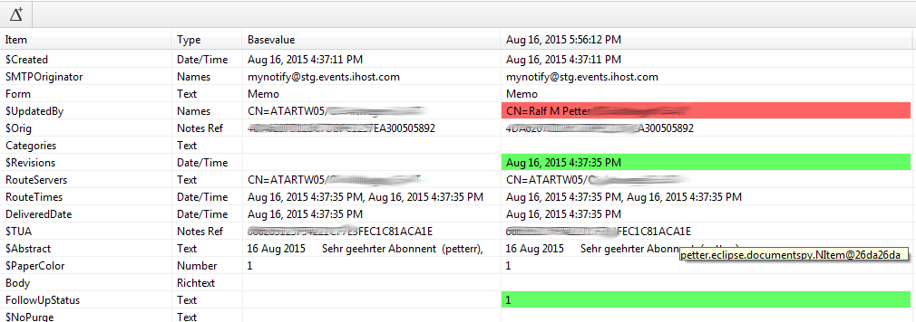 Now set the follow up flag on the mail we have selected for our snapshot and then go to your snapshot tab and press the "Delta" shortcut to reload the document as a new column. The document spy will compare the old basevalue column to the new column and will mark all rows witch changes. Values which are new have a green, changes have a red and values which are removed have a blue cell background.