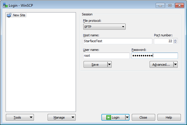 Nach dem ersten Starten müsst Ihr eure Starfaceanlage auf die Ihr zugreifen wollt in WinSCP anlegen. Füllt dafür die Felder Hostname, User name und Password entsprechend aus. Der Hostname ist der Name eurer Starface, als Benutzername müsst ihr "root" nehmen und das Passwort ist die Seriennummer eurer Starface Appliance falls Ihr es noch nicht geändert habt. (Stark empfohlen, wenn ihr die Starface produktiv einsetzt.)