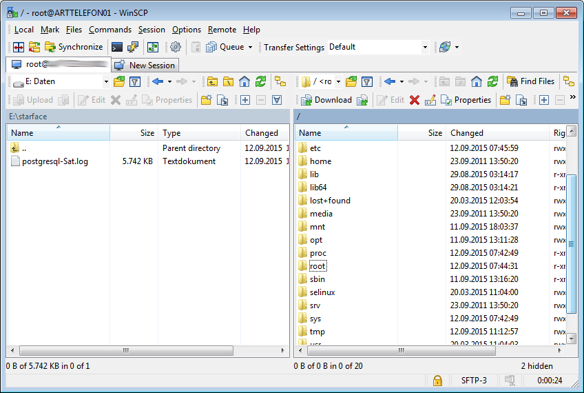 Nach dem Drücken von "Login" öffnet sich ein Explorer ähnliches Fenster in dem ihr Rechts den Inhalt des "root" Ordner auf eurer Starface sehrt und links habt ihr den Inhalt eines Ordners auf eurem lokalen Rechner. Wenn Ihr den kompletten Verzeichnisbaum der Starface "/" sehen wollt, müsst ihr aus dem "root" Ordner in das übergeordnete Verzeichnis wechseln.