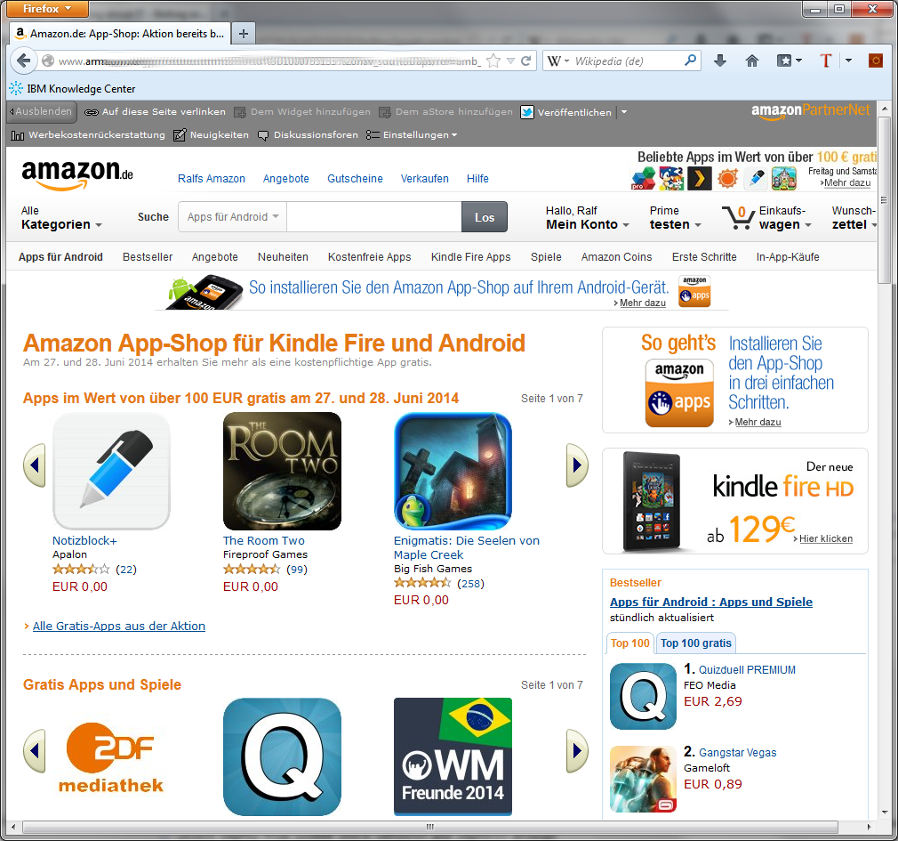 Wer sich bei der letzten Aktion einen Kindle Fire geholt hat, bzw. sich den Amazon Appstore auf seinem Androidgerät eingerichtet hat, sollte heute mal auf Amazon schauen, denn heute und morgen sind Apps im Wert von 100 EUR gratis. Also schnell zuschlagen.