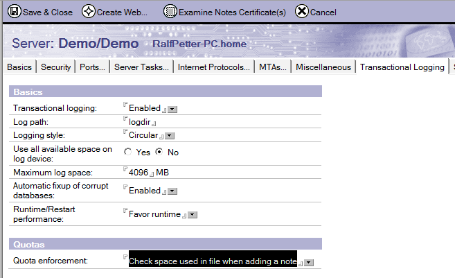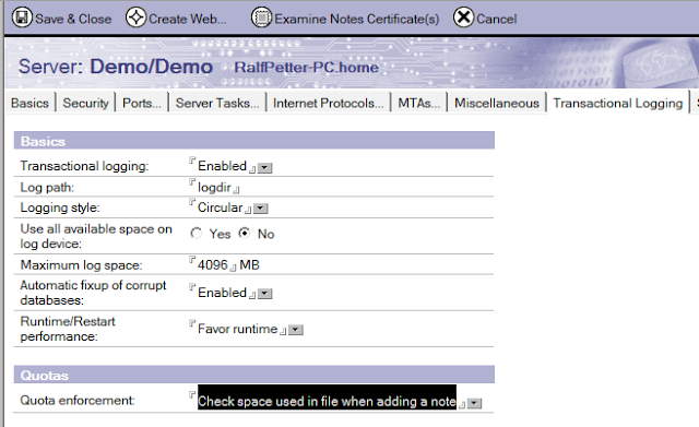 When you have set quotas for your mail files on a server with transaction logging enabled (I really hope everyone has logging enabled.) your users have the problem, that after they have deleted some mails there is no possibility to remove the whitespace from the database, because the option to compact is not available for databases which are transaction log enabled*. So many admins run "compact -c" regulary on all mail files to remove whitespace. But from a performance point of view copy style compacts are a really bad idea (I will provide more infos on this in a future blog post).