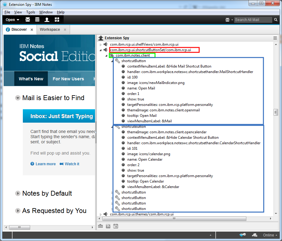 See the following screenshot for an example. I have opened the com.ibm.rcp.ui.shortcutButtonSet extension point in the com.ibm.rcp.ui (Marked with a red frame). This is the extension point which has to be used to extend the masthead in Notes 9 with your own icons. We see that all actions that are available in Notes are defined in the com.ibm.notes.client plugin (Marked in green) In the next level of the tree you can see what values the com.ibm.notes.client uses to extend the extension point. This can be very valuable source to find out how this extension point works and what to do to use this point for your own extension.