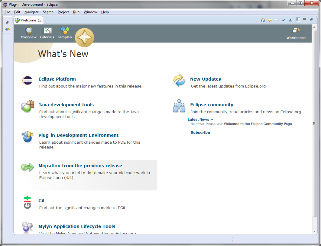 When everything works, you will get a designer window with a welcome screen. To close the welcome screen, choose "Close Perspective" from the Window menu.