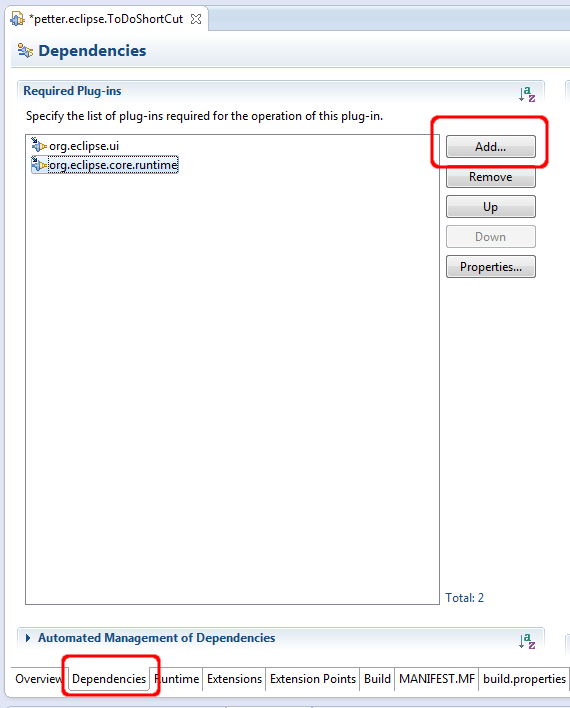 Open your plugin.xml with a double click. Go to the "Dependencies" tab and select "Add" to add a dependency.