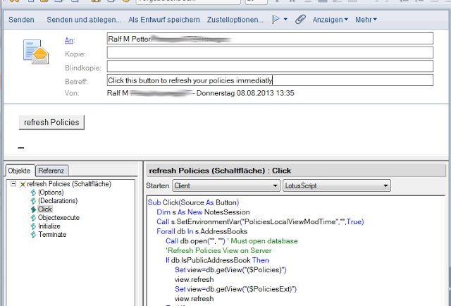 But one major annoyance of the implementation of Domino policies is that it is very unpredictable when the notes client will refresh his policies from the server. Especially in test environments you restart your clients often only to see that your changes on Policies are still not pushed to your test client. Or something in your client goes wrong and policies will not be updated anymore. So i have created a small lotus script program to delete the local cache of the policies and refresh all policies from the server which you can put in the click event of a button.