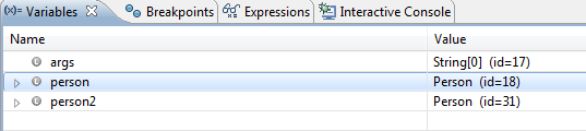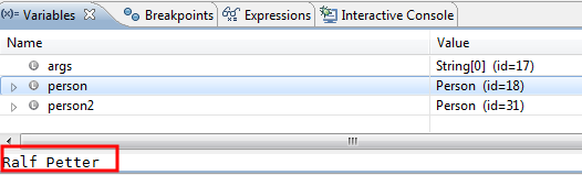 Man sieht hier auf den ersten Blick nur, dass das eine Objekt die id 18 hat und das andere die id 31. Erst wenn man das Objekt aufklappt, wird einem eine unter Umständen lange und unübersichtliche Liste aller Felder dieses Objekts angezeigt. Bei eigenen Klassen kann man die fehlende toString() Methode ja noch nachrüsten, aber bei fremden Klassen wäre man verloren wenn es nicht die "Detail Formatter" Funktion von Eclipse geben würde.