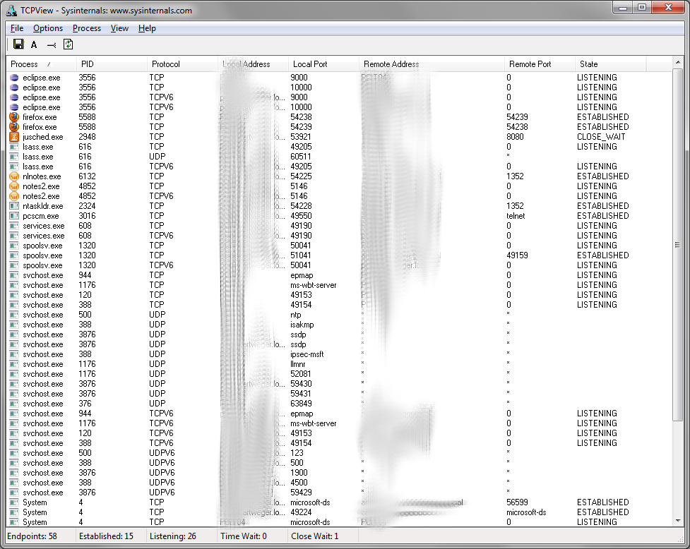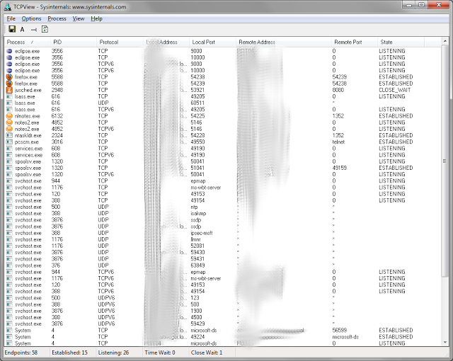 Windows has a command line tool to monitor which ports are used by which process called "netstat". But this tool is not very easy to use and on some operations very slow. But fortunatetly the genius guys from Sysinternals provide the great tool TCPView for this task. With this tool you see a overview of all used tcp ports and their status. So for example you can easily find out which process listens on which ports. You can even kill processes to free the ports in this tool.