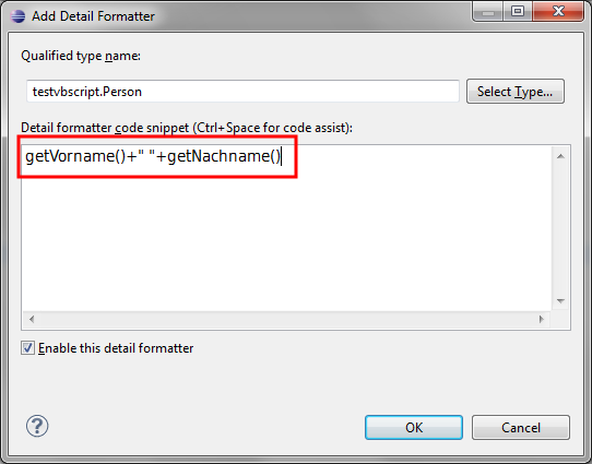 Jetzt kann man den Javacode angeben, der den String berechnet, den man gerne als Anzeige für diese Klasse im Debugger haben möchte. In meinen Fall hätte ich gerne für jedes Person Objekt den Vor und Nachname angezeigt.