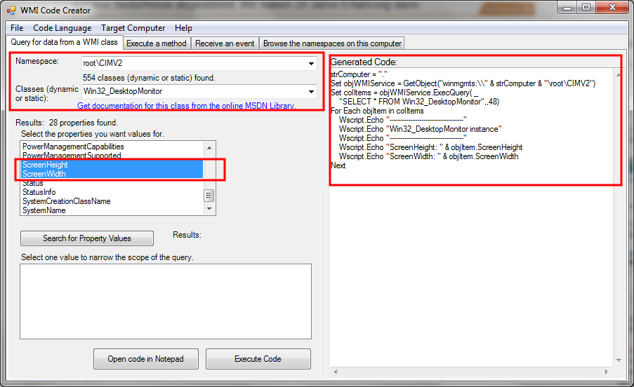 Obiges Gerüst kann man natürlich nicht nur für den obigen Zweck verwenden sondern mit den richtigen WMI SQL's kann man praktisch auf jede Info die in Windows gespeichert ist zugreifen. Um den Querystring zusammenzubauen kann man entweder die Doku in der MSDN durcharbeiten oder besser auf den genialen WMI Code Creator zurückgreifen.