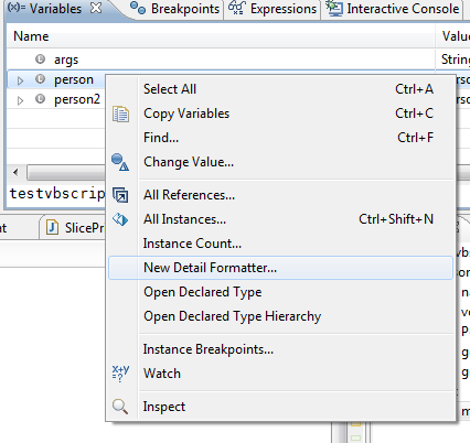 Die Detail Formatters bleiben persistent, das heißt sobald ich mir diesen einmal für eine Klasse erstellt habe, wird dieser in jeder Debugsession von Eclipse verwendet. Ich muss also jeden "Detail Formater" nur einmal definieren.