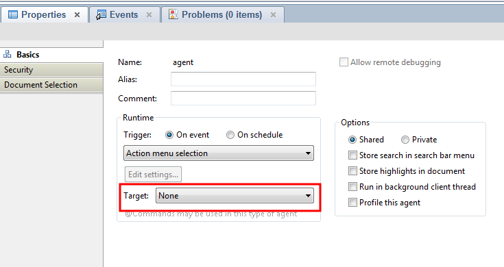 Wichtig bei dem Agent ist, dass man das Ziel auf "None" setzt. Sonst funktioniert der Zugriff auf das übergebene Dokument nicht zuverlässig.