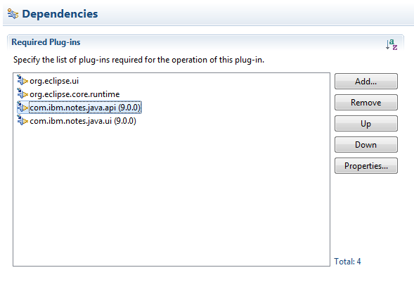 Als erstes muss man die Notes API (com.ibm.notes.java.api und com.ibm.java.ui) dem Plugin als Abhängigkeit hinzufügen.