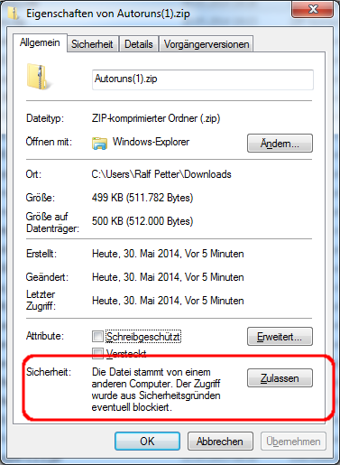Deshalb empfiehlt es sich bei allen heruntergeladenen Dateien insbesondere bei Archiven von denen man weiß, dass Sie aus einer zuverlässigen Quelle sind, dieses Flag vor der Verwendung zu entfernen.