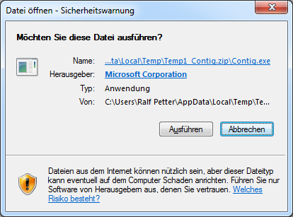Windows besitzt eine Sicherheitsfunktion die bewirkt, dass Dateien die aus dem Internet heruntergeladen mit einem speziellen Flag versehen werden. Durch dieses Flag kommt beim Aufrufen der Datei eine Sicherheitswarnung die einen darauf aufmerksam macht, dass das Ausführen dieser Datei potentiell gefährlich ist.