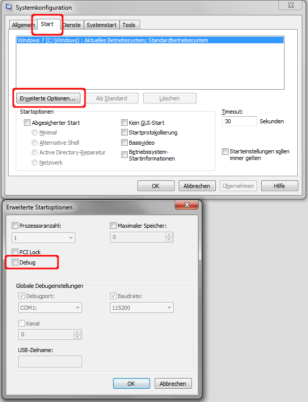 To check/deactivate the debugger start "msconfig.exe" with admin privileges and disable the debugger in the extended options on the start tab.