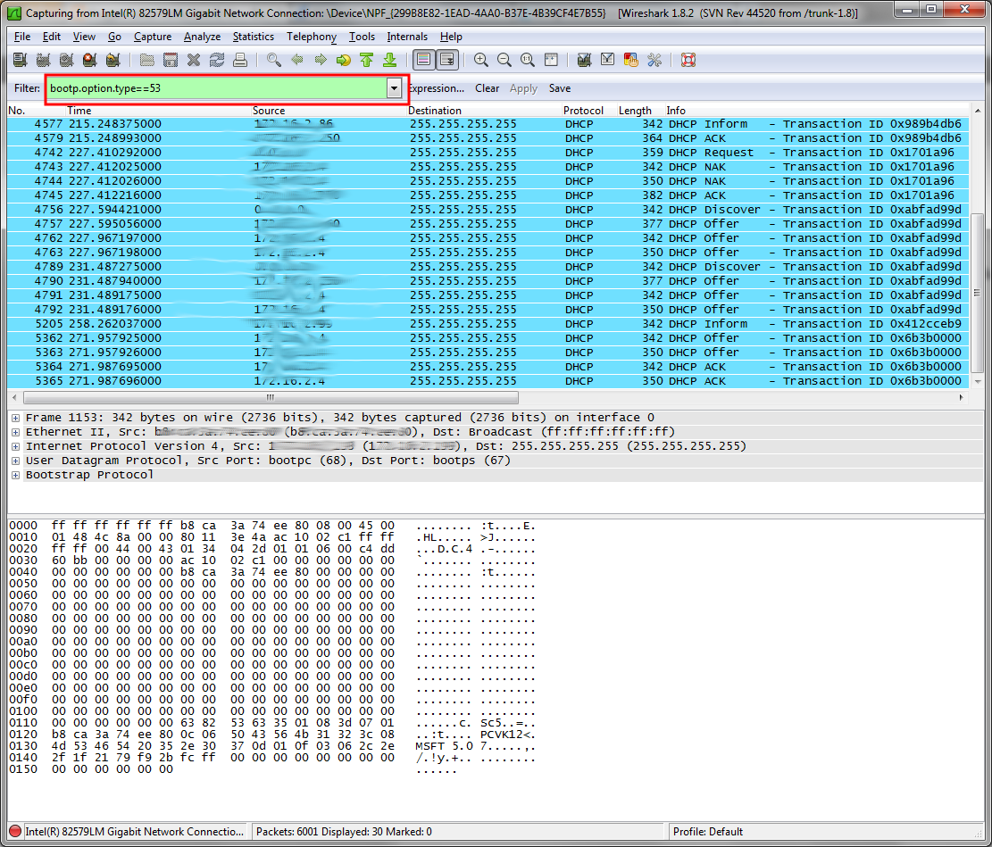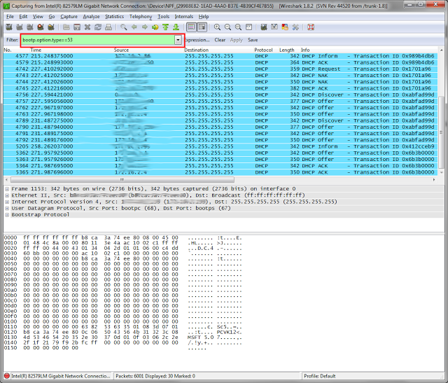 The best tool to analyze weird problems in DHCP Systems is the network analysator Wireshark. But the network traces of wireshark can be very big and confusing. So you have to use filters to select only the traffic you really need to solve your problem. To see only DHCP traffic on your network interface you have to apply "bootp.option.type==53" in Wireshark.