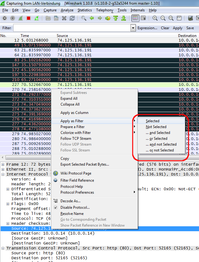 But fortunately there is an easy way to create a filter. Simply click on the field in the packet trace detail for which you want to create a filter with the right mouse button and choose the correct "Apply as Filter" context menu. If you have already set a filter and want to add the field as an additional filter criteria choose one of the "... xxxx" entries. That's so easy that i am really angry i had not known this earlier.